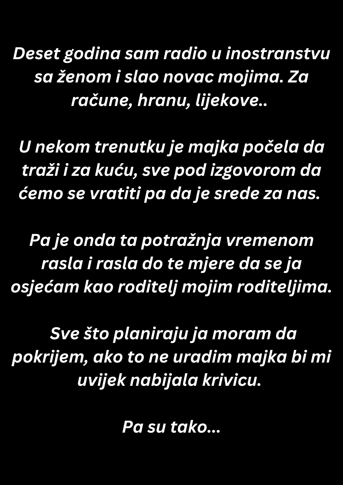 U početku, sve je izgledalo kao savršen plan. Odlazak u inostranstvo bio je motivisan željom da se pruži bolji život, što je često san mnogih koji žele pobjeći od ekonomske nesigurnosti svoje domovine. Njegova majka je tražila pomoć za renoviranje kuće, što je muškarac s radošću prihvatio. Želio je stvoriti dom koji će biti topao i prijatan kada se vrati. Međutim, s vremenom su se očekivanja povećavala, a pritisak je postajao sve teži. Umjesto da se zadovoljstvo proširuje, ono je sve više postajalo opterećenje. Svaka ispunjena želja dovela je do nove, a on se suočavao sa osjećajem da njegovo vlastito postojanje postaje samo uslužna funkcija za roditelje.