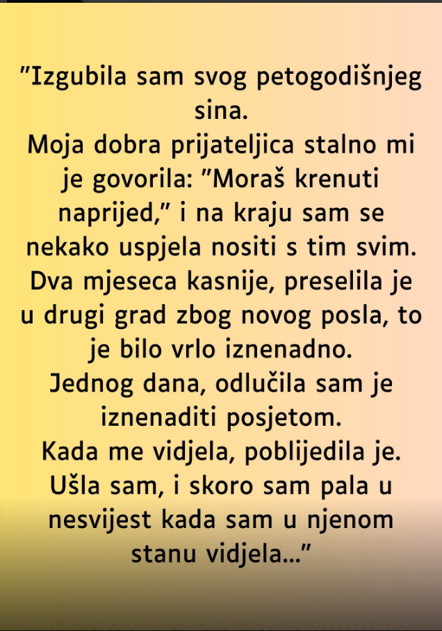 Na početku svega, ova žena je bila u dubokom emocionalnom kolapsu. Gubitak sina, takva tragedija, nije nešto što bi netko mogao lako da preživi. Iako joj je prijateljica savjetovala da krene naprijed, ni ona sama nije bila sigurna kako da nastavi dalje. Prošlo je nekoliko mjeseci, ali osjećaj praznine nije prolazio. Osim što je pokušavala svakodnevno da se nosi s tim, sve je ostalo kao u magli, a ona se osjećala kao da je ostala zarobljena u vlastitoj tami. Zamišljala je život bez njega, ali nikada nije vjerovala da će morati ići kroz njega bez njega.