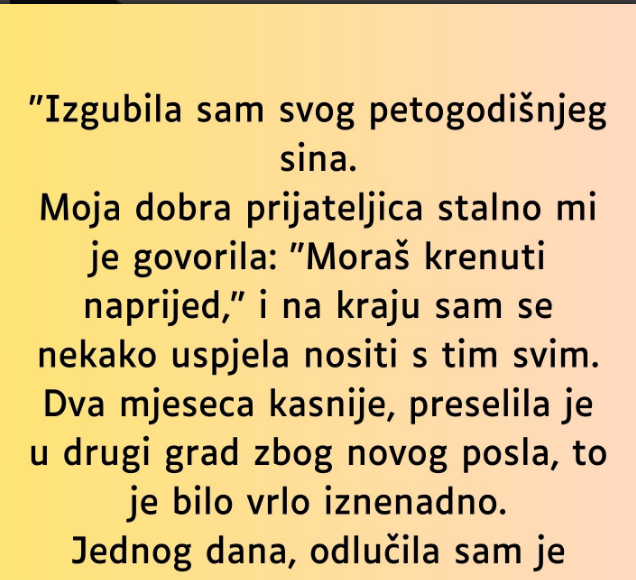 • Ovo je priča o jednoj majci koja je izgubila svog petogodišnjeg sina, i o prijateljici koja ju je iznenadila nečim što nitko nije mogao ni predvidjeti.