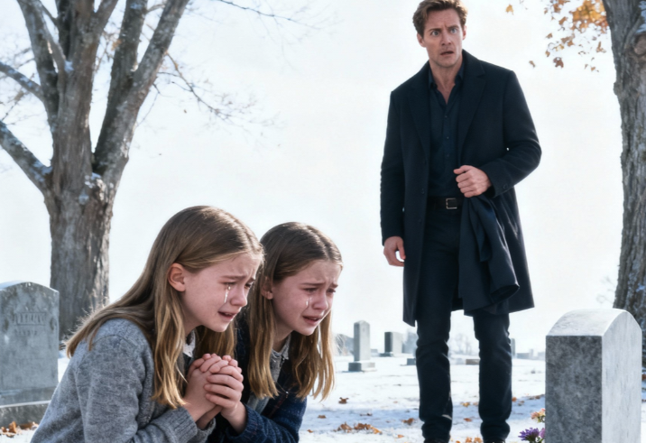dvije djevojčice koje stoje pored cvijećem prekrivenog groba, držeći se za ruke.