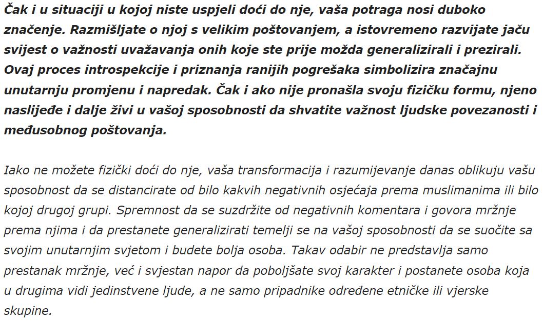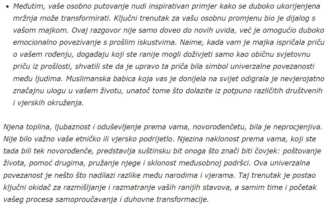 Na kraju, hvala vam što ste podijelili svoju priču. Ona ne samo da priznaje prošle greške, već nas vodi prema boljoj i pravednijoj budućnosti. Svi mi imamo sposobnost da se transformišemo i promijenimo, a vaša priča je svjetionik nade za mnoge. Razumijevanje i empatija mogu pomoći u izgradnji mostova prema boljem sutra, gdje mržnja i nepovjerenje neće imati mjesto. U tom smislu, naš zajednički cilj trebao bi biti izgradnja društva gdje se svaka osoba osjeća poštovano i cijenjeno, bez obzira na svoje porijeklo, vjeru ili uvjerenja. Na taj način, možemo učiniti korak naprijed ka boljem sutra za sve nas.