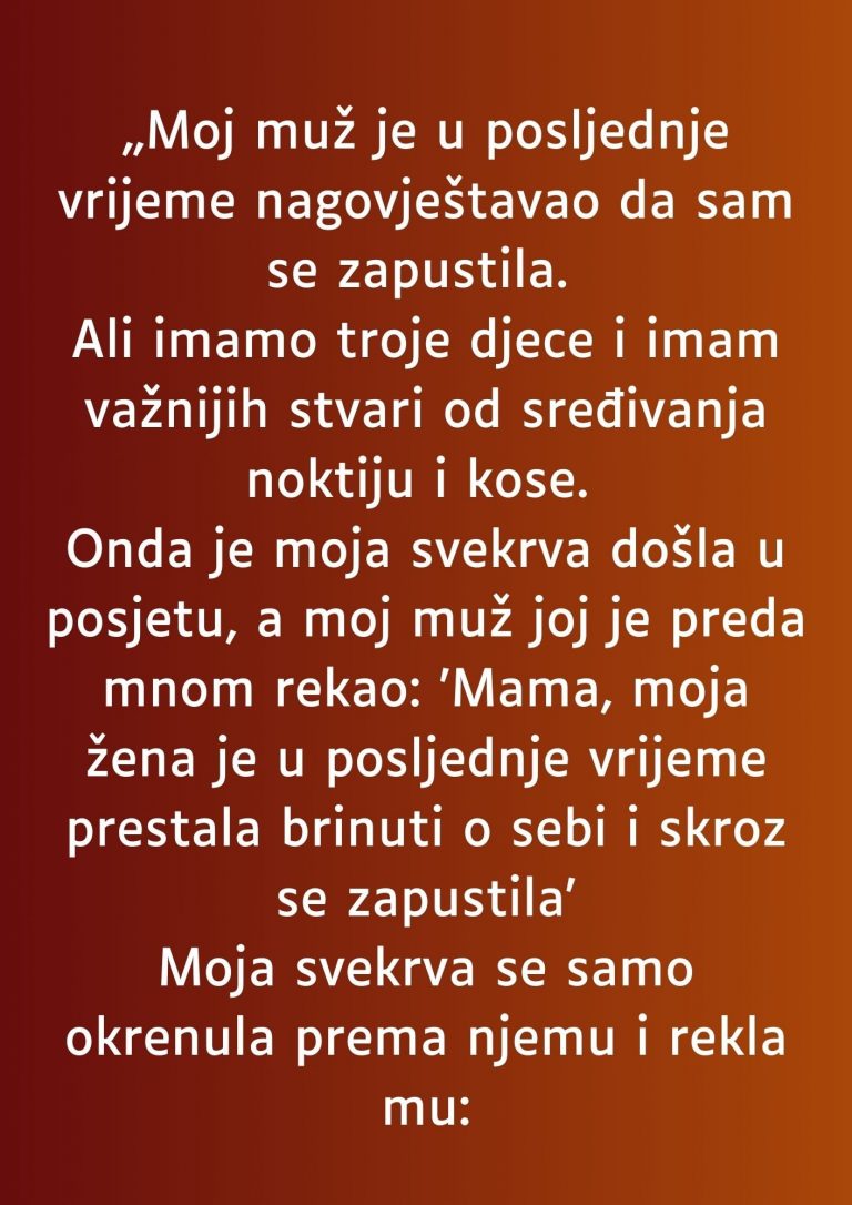 Ova situacija postavlja temelje za širu diskusiju o tome kako kritika može uticati na emocionalno stanje partnera. Naime, kritički ton i fokus na fizičke aspekte mogu dovesti do dubokih nesigurnosti i sumnji u vlastitu vrednost. Takođe, važno je napomenuti da je u ovom slučaju muž otvoreno govorio svojoj majci o problemima u njihovom braku, što može ukazivati na nedostatak komunikacije između njega i njegove supruge. Njegove reči, poput: „Mama, moja žena se skroz zapustila“, nisu bile samo kritika njenog izgleda, već su odražavale i dublji problem u njihovom braku. Žena se trudila da balansira brojne obaveze, uključujući brigu o troje djece i vođenje domaćinstva. Međutim, njen trud nije bio prepoznat i to je stvorilo dodatne tenzije između njih.