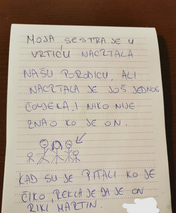 Jedan od zanimljivih primjera dječijeg crteža dolazi iz jednog vrtića, gdje je mala djevojčica odlučila nacrtati svoju porodicu. Na crtežu su se našli mama, tata, sestra, ali i nepoznati muškarac. Kada je vaspitačica pitala ko je taj čovjek, djevojčica je s osmijehom rekla: „To je naš novi komšija koji se preselio!“. Ovaj komentar nije samo nasmijao sve prisutne, već je i ukazao na dublju poruku o tome kako djeca prihvataju nove ljude i promjene u svom okruženju.