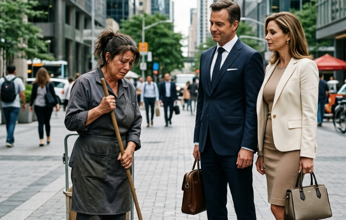 Jednog jutra, dok je grad već bio u punom ritmu, žena u jednostavnoj radnoj uniformi čistila je trotoar ispred velike poslovne zgrade. Njeni pokreti bili su smireni, gotovo neprimetni. Upravo u tom trenutku pojavio se njen bivši muž, Ethan, u društvu svoje verenice.