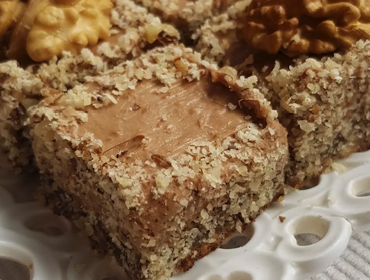 - Svaka kocka se sa bočnih strana uvalja u mlevene orahe.