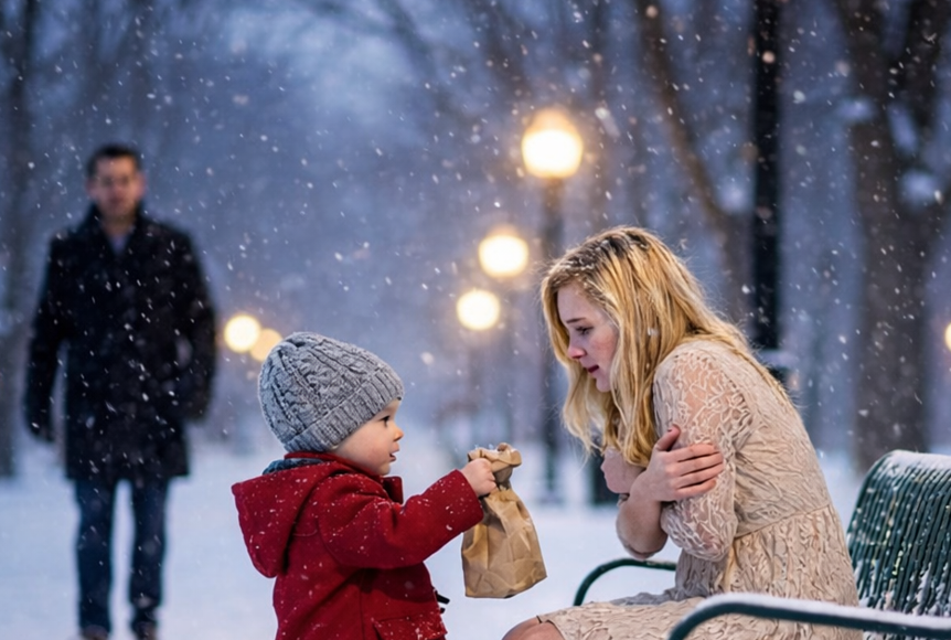 Dok je pokušavala da ostane neprimetna, ispred nje se iznenada zaustavila devojčica od oko četiri godine. Bila je obučena u topli kaput, sa kapom koja joj je prekrivala uši, i držala je mali papirni paket u rukama.