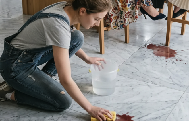 Maja je klečala na hladnom mramornom podu i ribala mrlju od vina. Ruke su joj bile crvene, kosa slijepljena uz lice, a ramena su joj podrhtavala od suza.