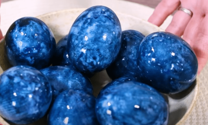 Nakon što su jaja bila umotana, stavila su se u posudu s ohlađenim zelenim čajem na 24 sata. Tijekom tog vremena, boje su se duboko upile u ljusku, stvarajući tamno plave i ljubičaste tonove.